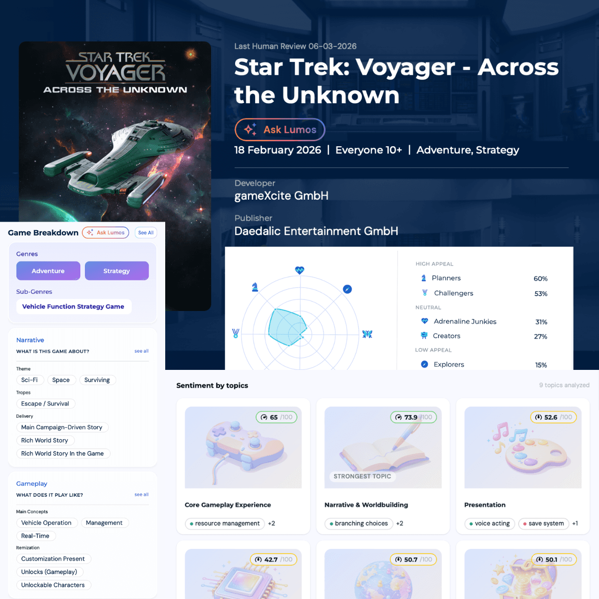Why do some games explode while others disappear? Lumos breaks down what makes games click—from mechanics and emotional tone to player fit and market traction. Go beyond dashboards and discover the “why” behind hits, flops, and everything in between.