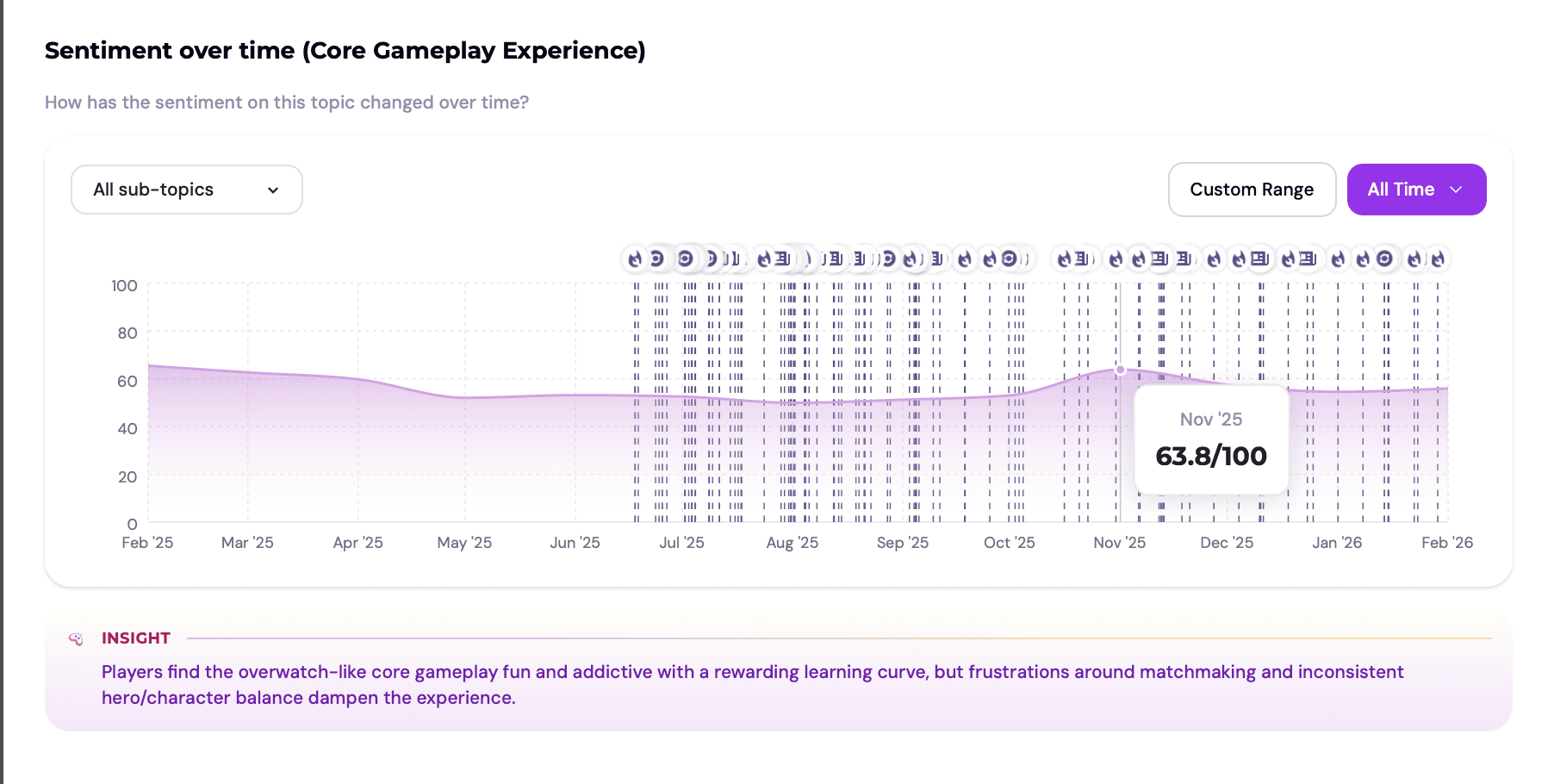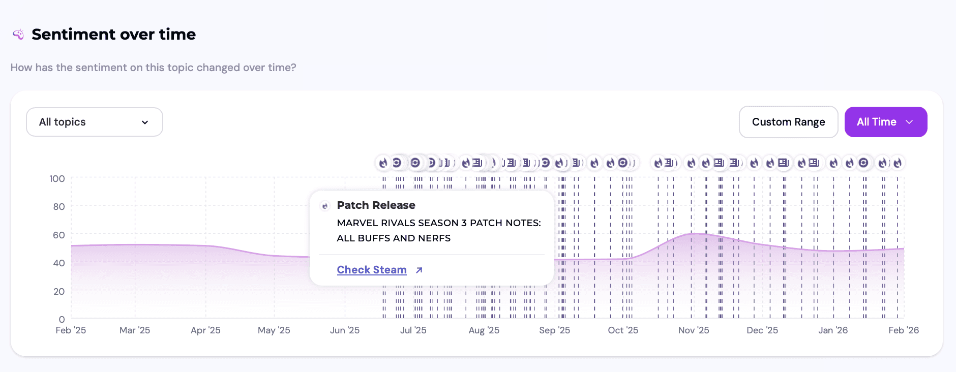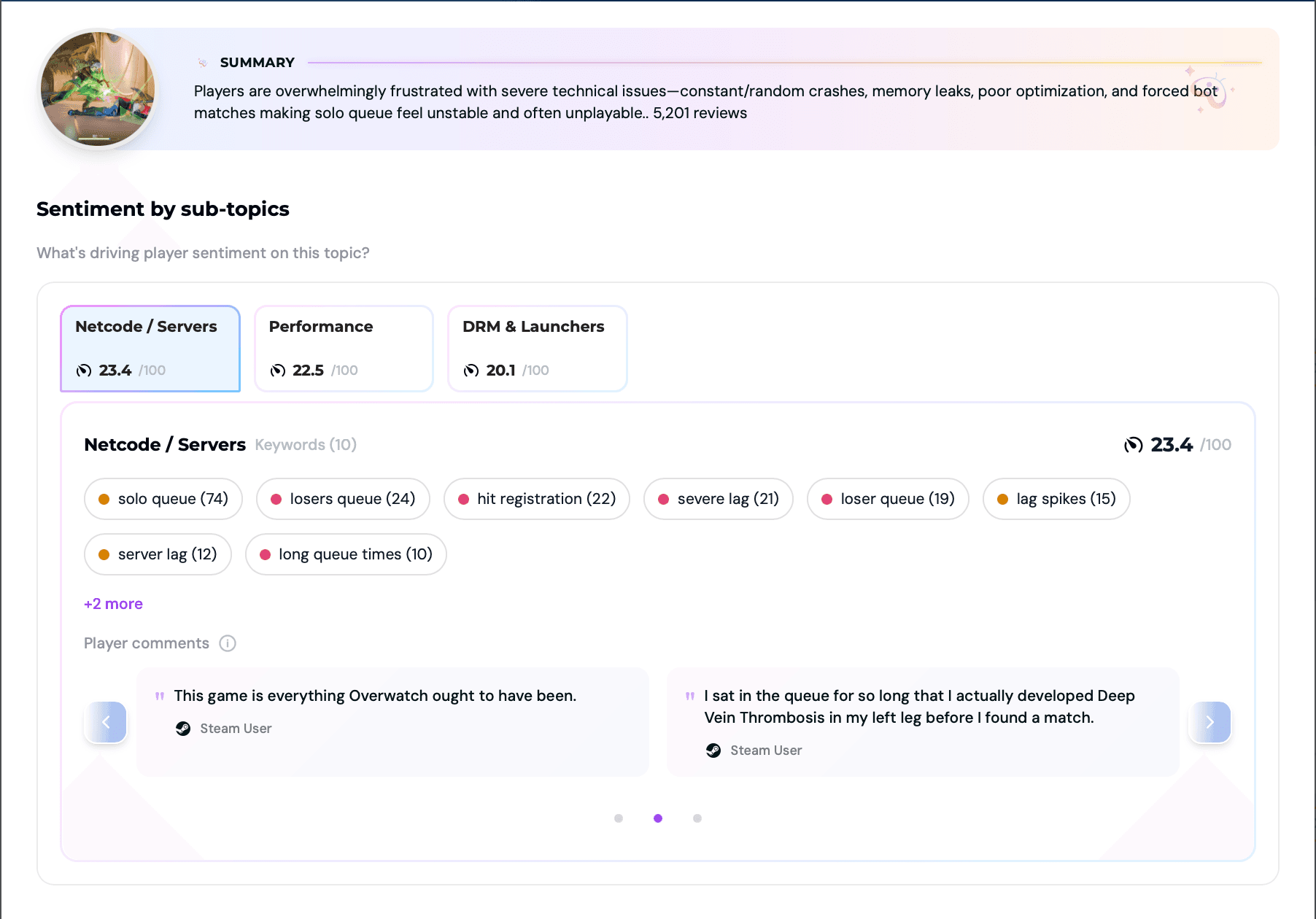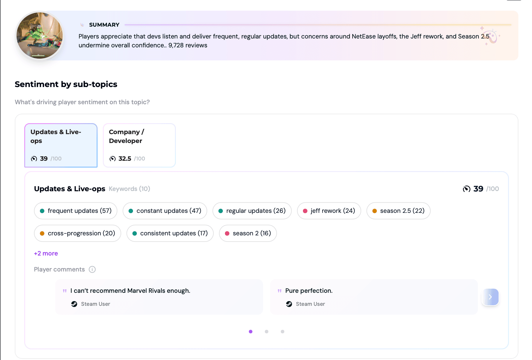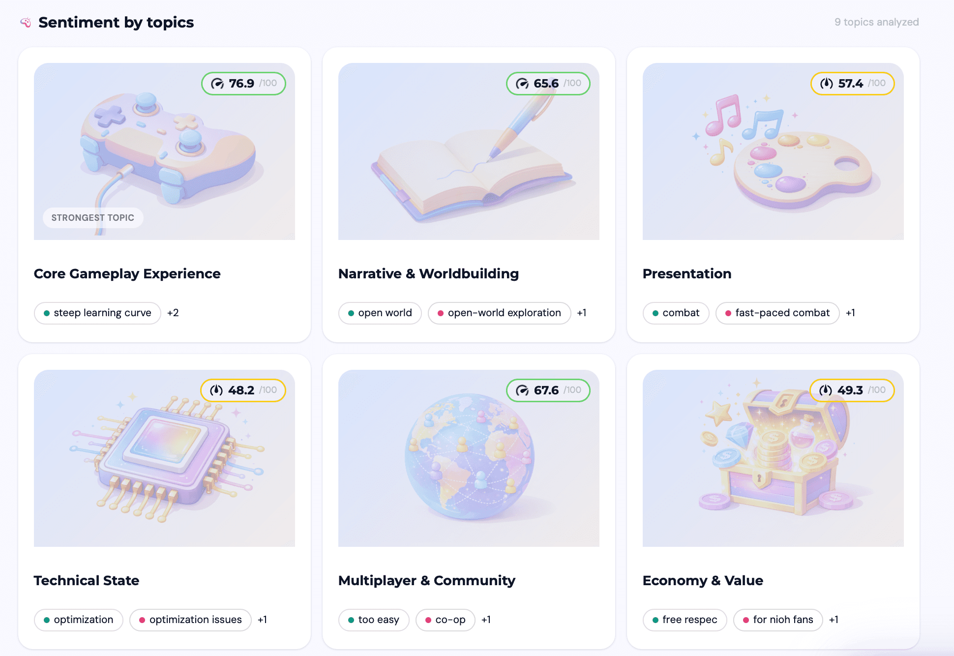 You can now see how players feel about a game broken down across 12 major topics and 23+ sub-topics, backed by evidence volume, and mapped to specific update events.