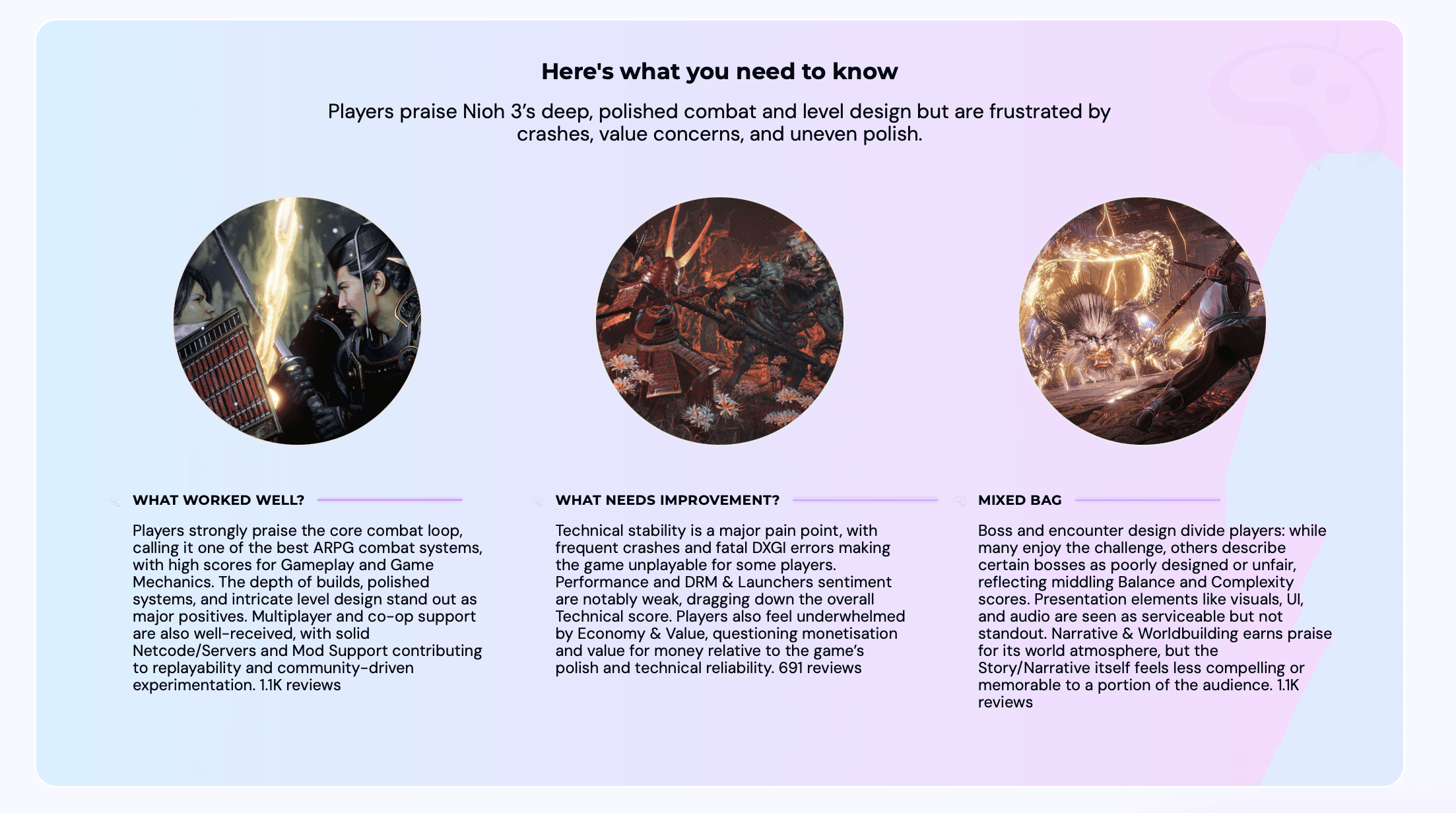 Developers use structured sentiment to prioritize correctly, especially when they also need deeper analysis of game mechanics and features to understand what actually drives engagement.