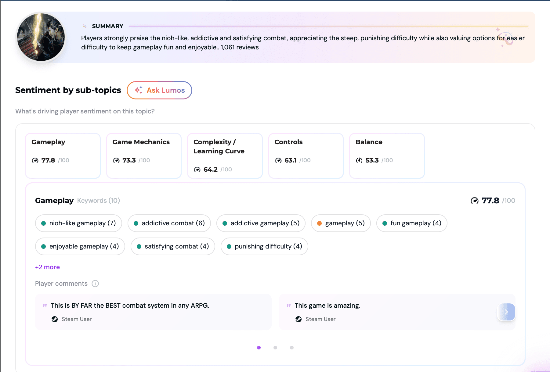 When 7,500 players mention performance issues, that is structurally different from three loud Reddit threads. Lumos sentiment analysis tools are designed to process large volumes of unstructured data, enabling reliable analysis and real-time insights from Steam reviews.